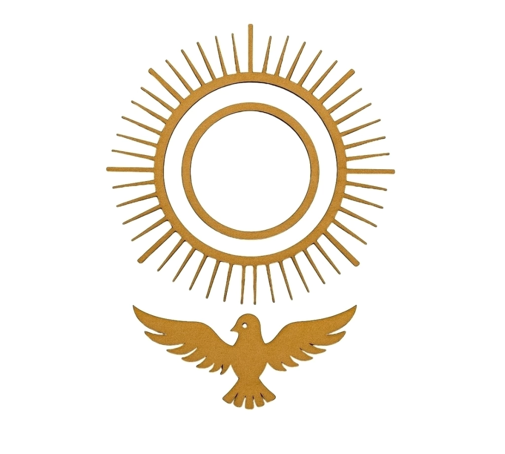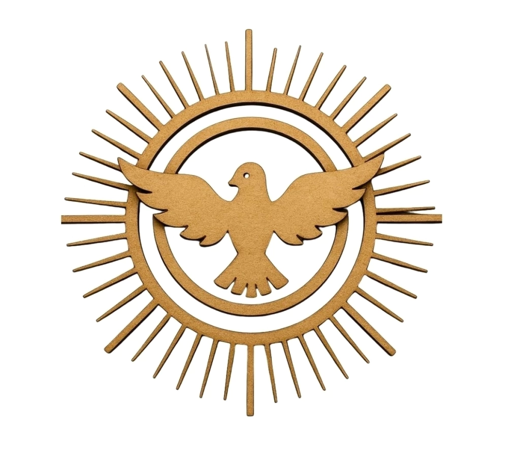 O aplique sobreposto Espírito Santo com resplendor raiado MDF cru 12cm é uma peça simbólica e decorativa, perfeita para artesanato, decoração religiosa e lembrancinhas especiais. Produzido em MDF cru de alta qualidade, é cortado a laser para garantir bordas precisas e detalhes limpos.