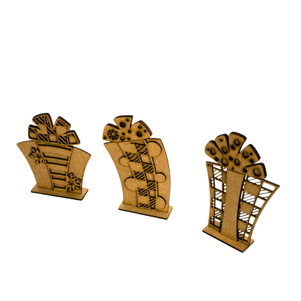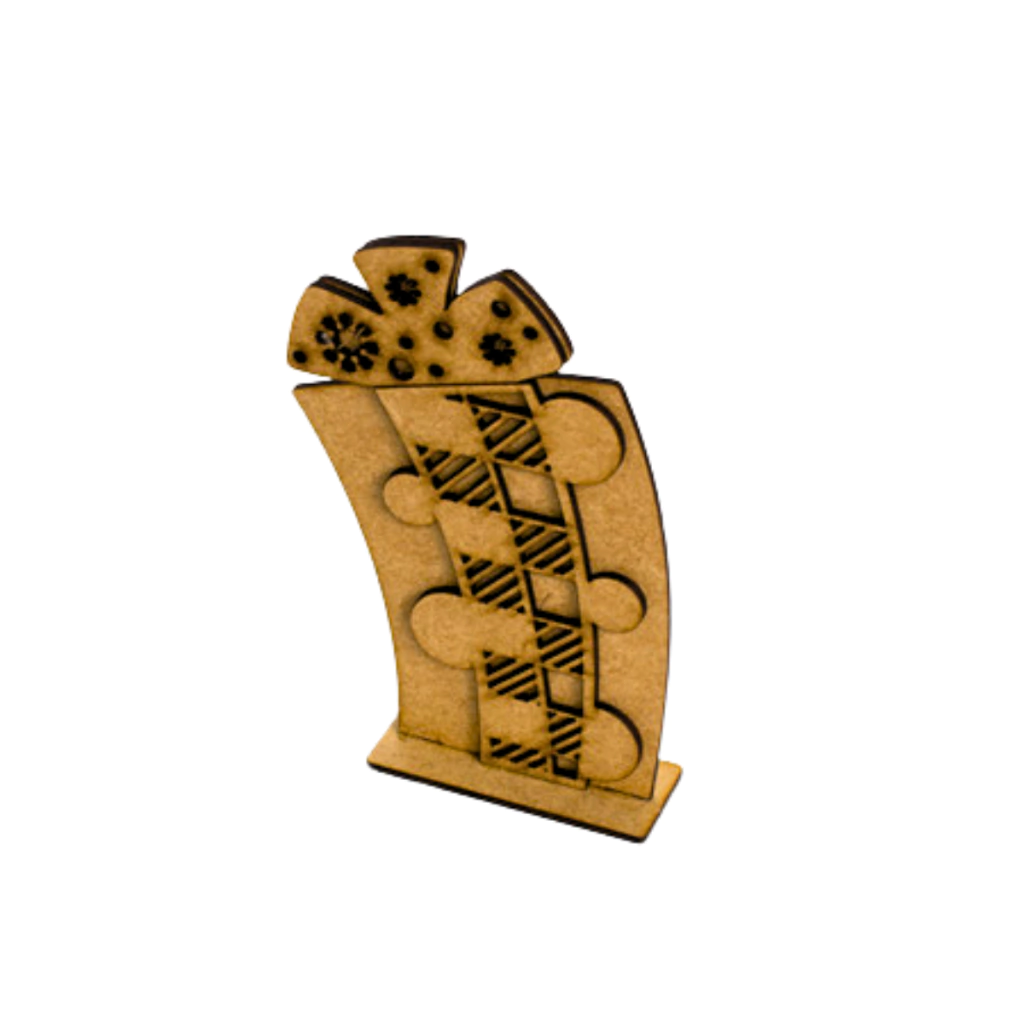 O Enfeite MDF Caixa de Presente de Natal com Base é uma peça encantadora e cheia de personalidade, ideal para compor decorações natalinas criativas, vitrines temáticas ou kits artesanais de fim de ano. Produzida em MDF cru com corte a laser de alta precisão, a peça simula uma charmosa caixa de presente com laço no topo e formato torto, oferecendo um visual divertido e moderno. A estrutura em 3D, combinada com a base de sustentação, garante estabilidade e um excelente acabamento visual para quem deseja montar decorações natalinas diferenciadas.