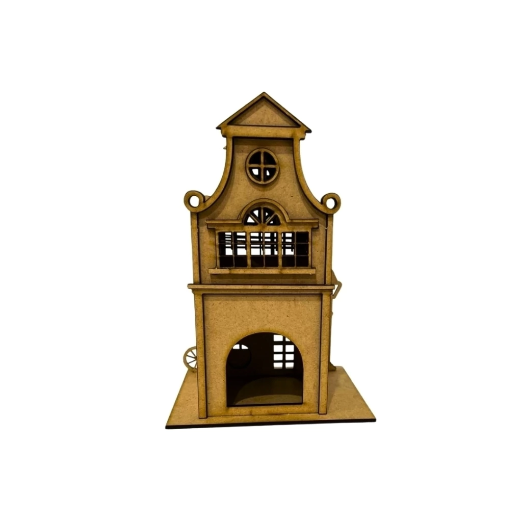 Produzida em MDF cru de 2,5mm, a casinha é leve, resistente e enviada desmontada, garantindo segurança no transporte e praticidade para o cliente. Seu design é minuciosamente recortado a laser, valorizando portas, janelas e linhas arquitetônicas típicas das construções holandesas.