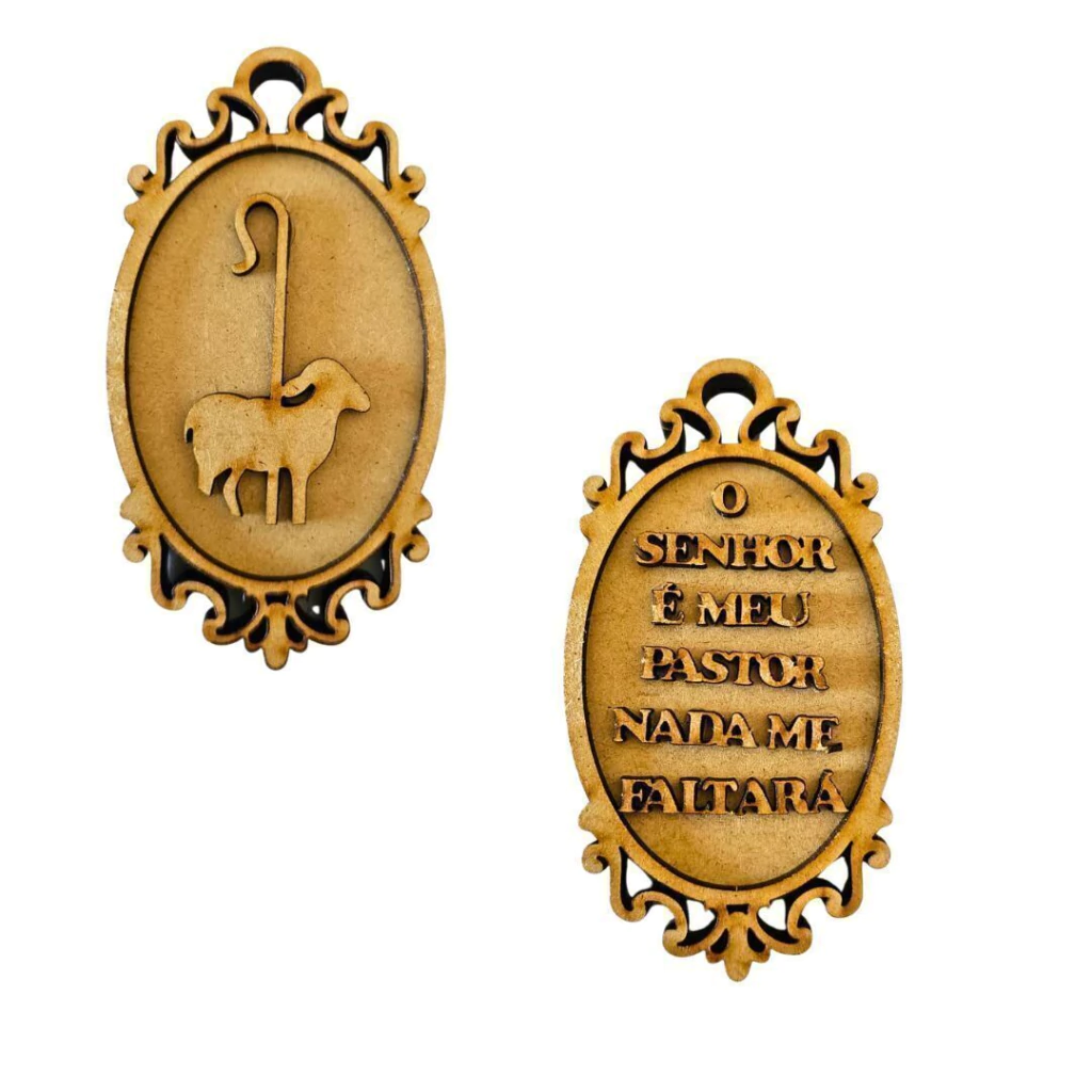 Na frente, apresenta a figura do cordeiro e do cajado de pastor, símbolos universais de cuidado e proteção divina. No verso, está gravada a frase bíblica “O Senhor é meu Pastor, nada me faltará” (Salmo 23), uma das passagens mais conhecidas e amadas pelos cristãos.