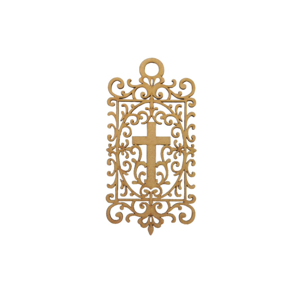 No centro da peça está uma cruz em destaque, também recortada a laser, simbolizando proteção e devoção. O design vazado valoriza a estética da peça e permite personalizações diversas com pintura, pátina, douração ou aplicação de pedrarias. A parte superior conta com uma argola grande integrada à peça, facilitando sua fixação e aplicação como pendente.