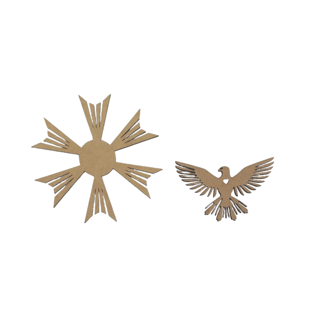 Produzido em MDF cru de 2,5mm, o escapulário possui um resplendor vazado de 13cm de diâmetro, com raios que representam luz divina. Sobreposto a ele, está o Espírito Santo em forma de pomba com asas abertas, medindo 10x6cm, e um coração vazado no centro, representando o amor de Deus.