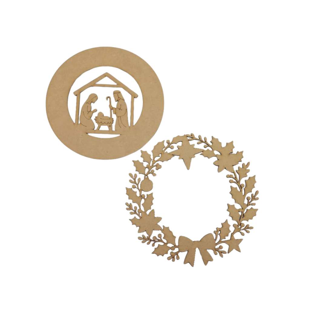 Fabricada em MDF cru de 2,5mm, a guirlanda tem formato redondo com centro vazado onde está representada a Sagrada Família. A estrutura da peça possui uma borda grossa e lisa que dá estabilidade e presença visual. Sobre essa base, há uma segunda guirlanda sobreposta, composta por recortes decorativos de viscos, bolinhas natalinas, estrelas e laço — todos com efeito 3D, gerando profundidade e destaque.
