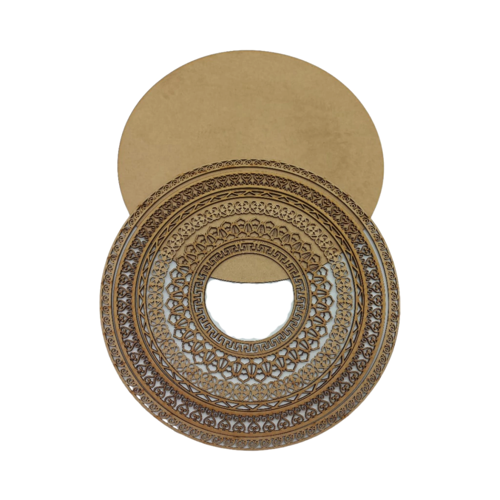 Os aros redondos possuem recortes ornamentais e são sobrepostos à base, formando uma estrutura que pode ser usada em murais, quadros, guirlandas, placas decorativas ou suportes para trabalhos em tecido, papel, crochê ou pintura. Seu design vazado agrega sofisticação e é um excelente ponto de partida para projetos artesanais criativos e personalizados.