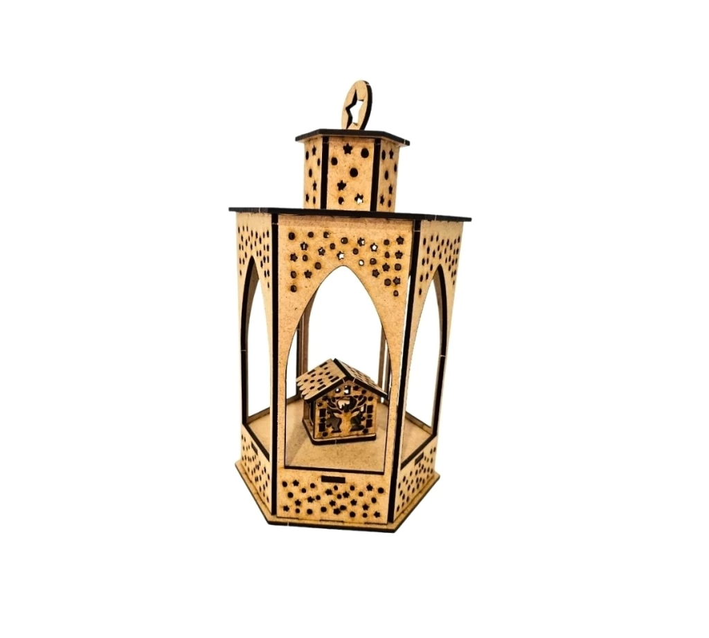 Fabricada em MDF cru de 2,5mm com corte a laser de alta precisão, essa peça reúne beleza, versatilidade e a oportunidade de personalização. Seu design hexagonal traz recortes delicados de estrelas, arcos e detalhes geométricos que proporcionam um efeito único quando combinada com iluminação de LED ou vela eletrônica (não inclusas).