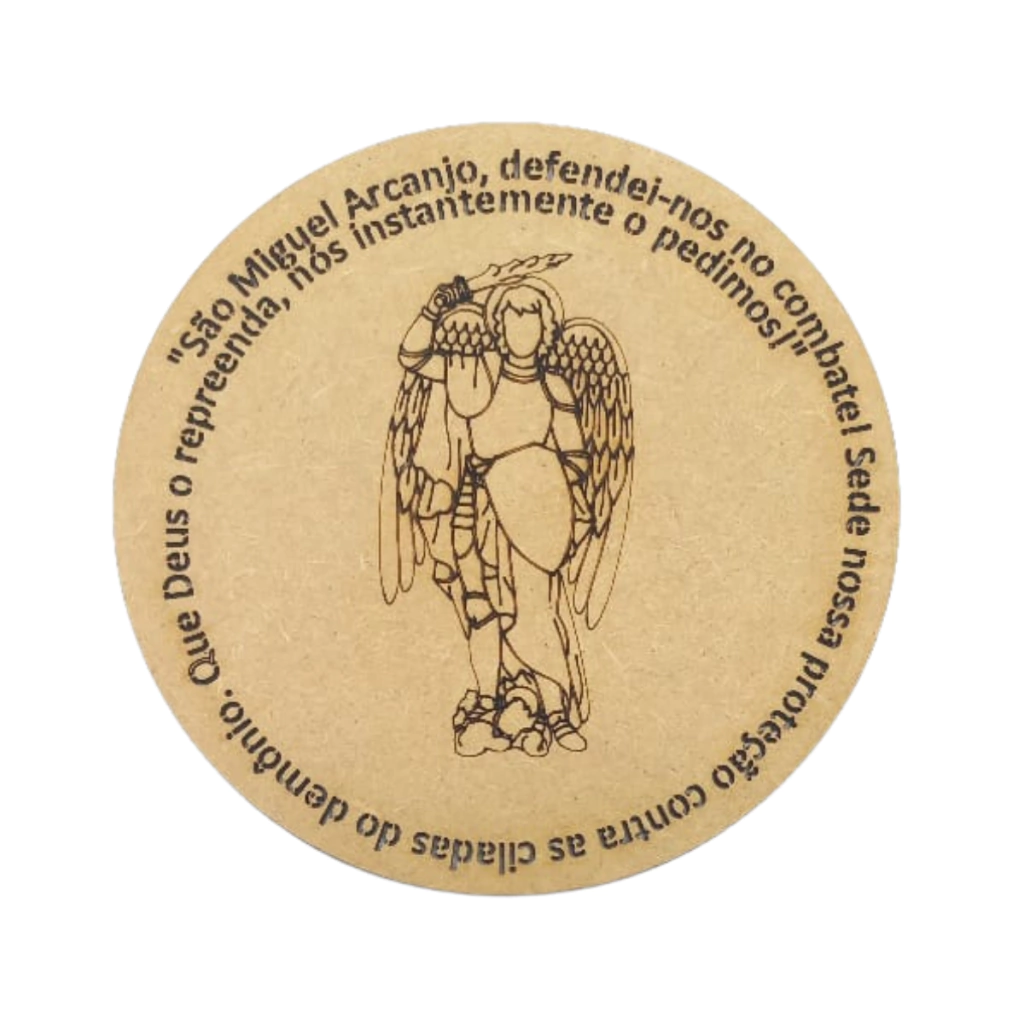 ✔ Detalhes: Imagem do Anjo São Miguel Arcanjo no centro e oração vazada ao redor: