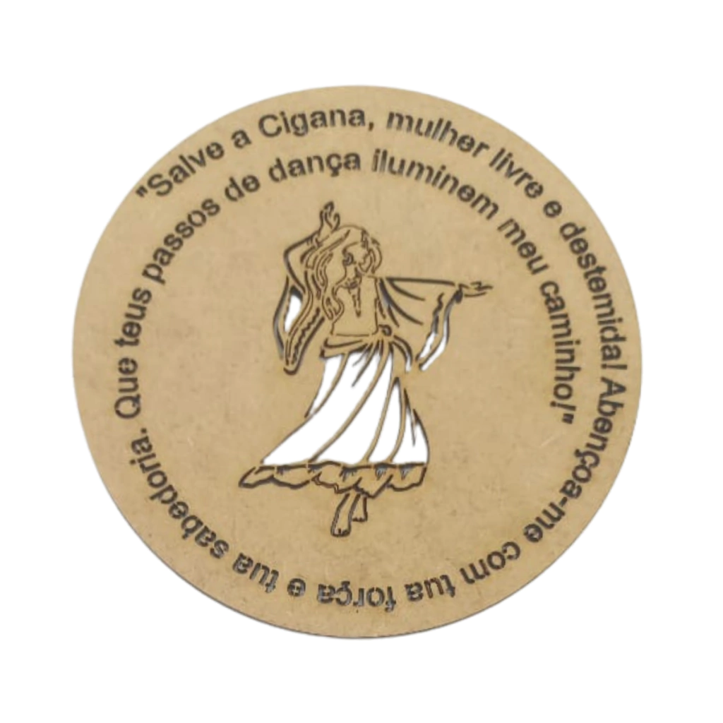 Com um design redondo, a peça traz a imagem de uma Cigana gravada no centro, além da oração vazada ao redor, que diz: