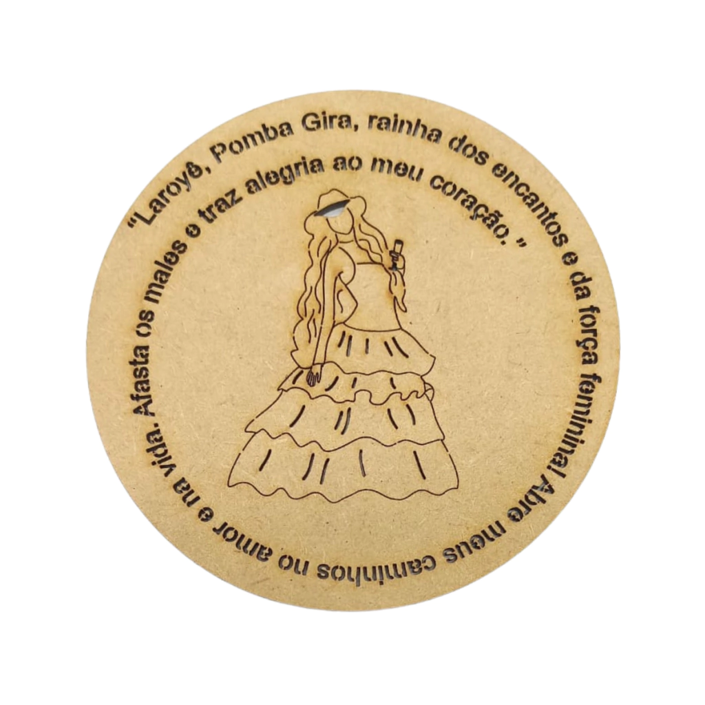 Com um design redondo, a peça traz a imagem de Pomba Gira gravada no centro e, ao redor, a oração vazada com os seguintes dizeres: