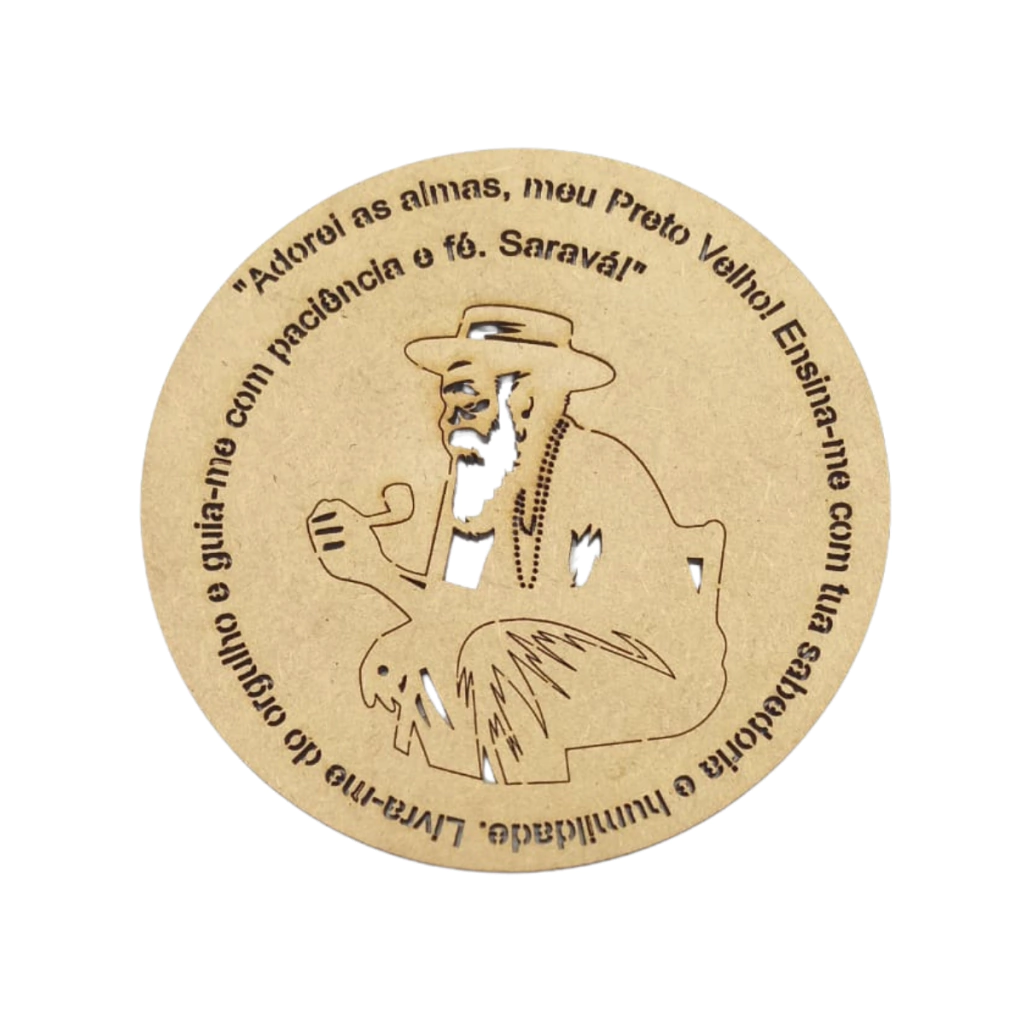 Com um design redondo, a peça traz a imagem do Preto Velho gravada no centro, além da oração vazada ao redor, que diz: