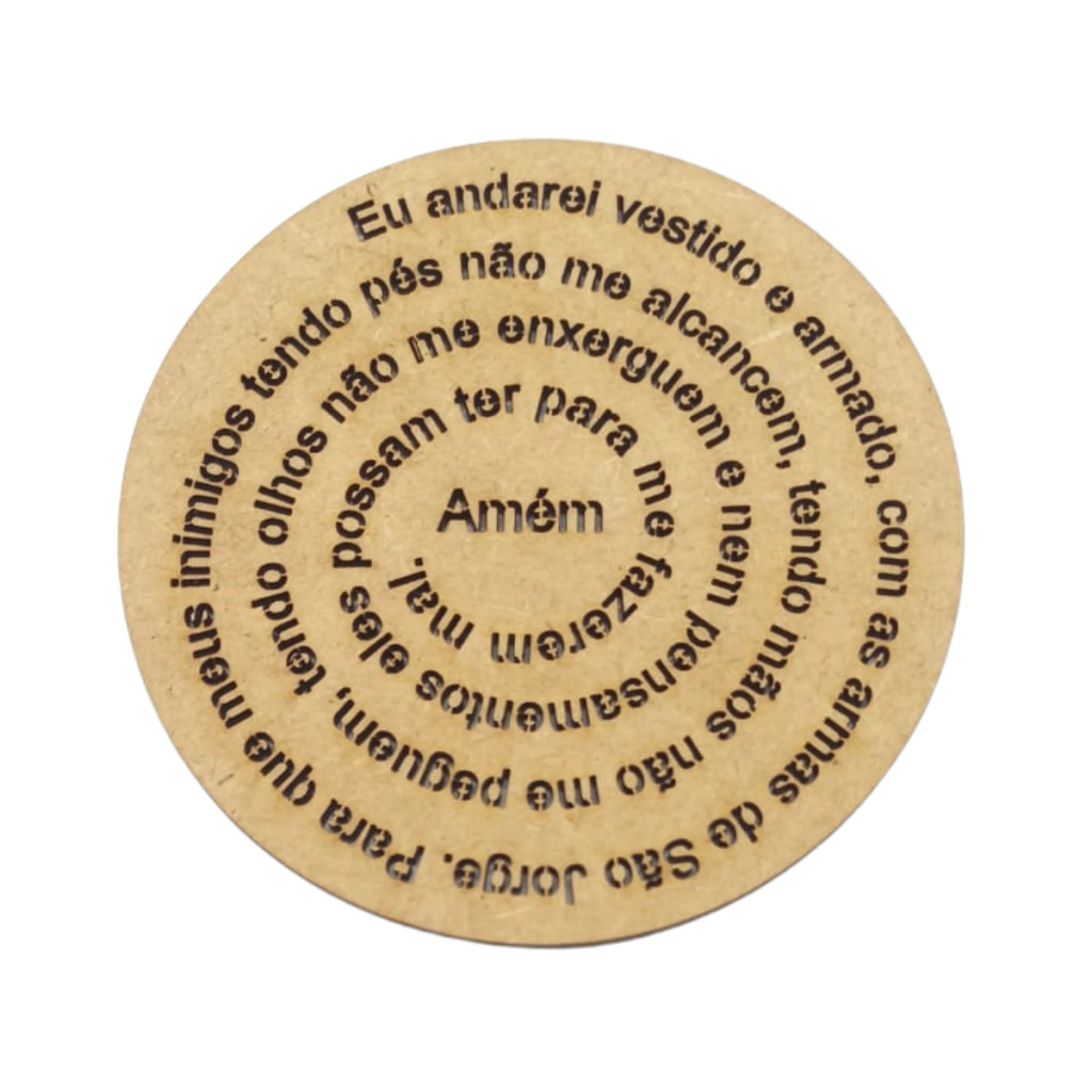A Mandala MDF Oração São Jorge é um item de decoração religioso que transmite força, proteção e fé. Produzida em MDF cru de 2,5mm, essa peça possui um design redondo e vazado, com a palavra "Amém" no centro e a oração de São Jorge gravada ao redor.