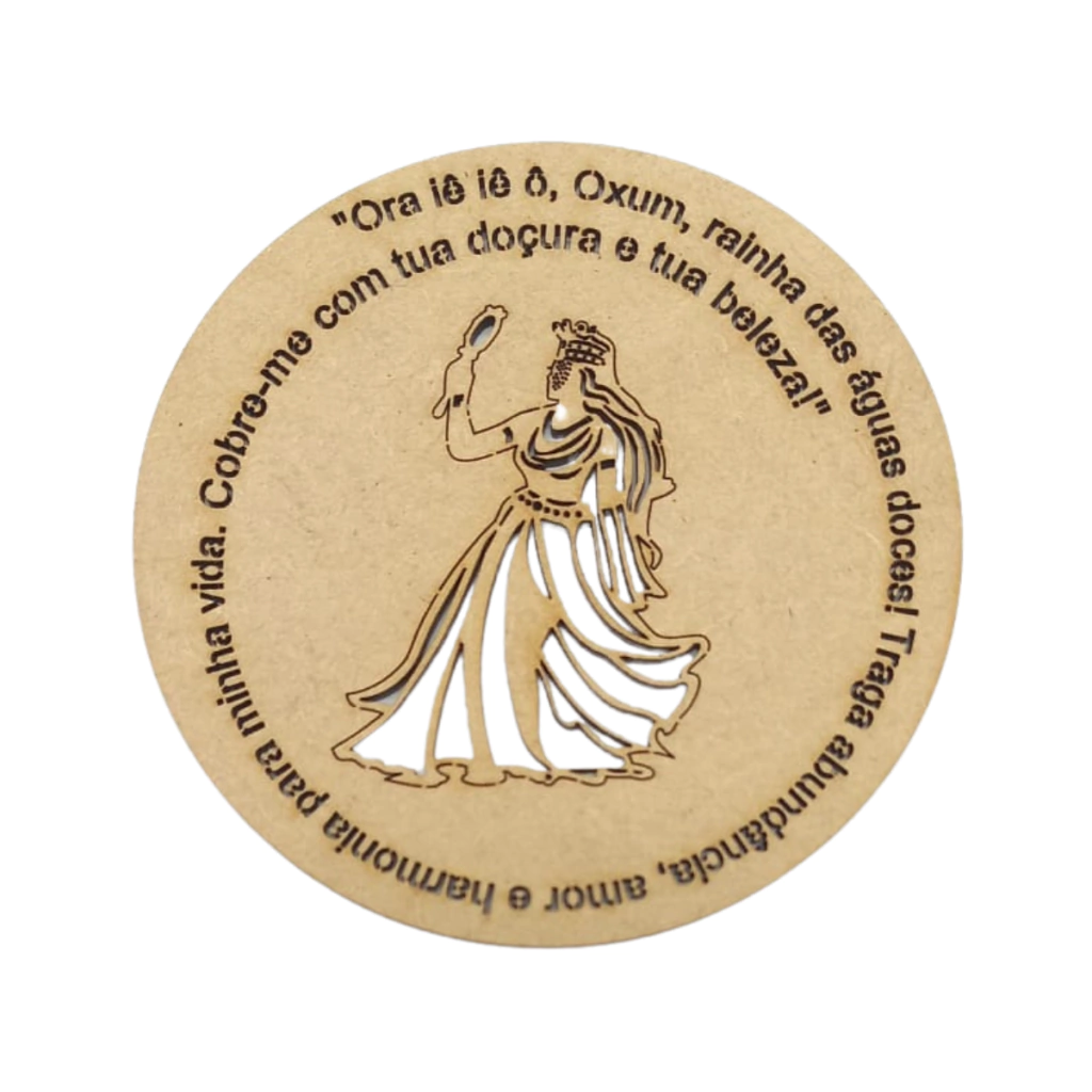 Feita em MDF cru de 2.5mm, esta mandala apresenta no centro a imagem vazada de Oxum, enquanto ao redor contém a oração: