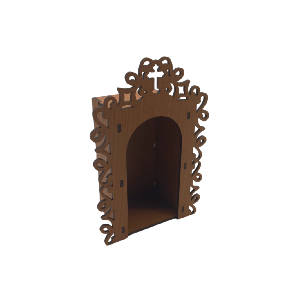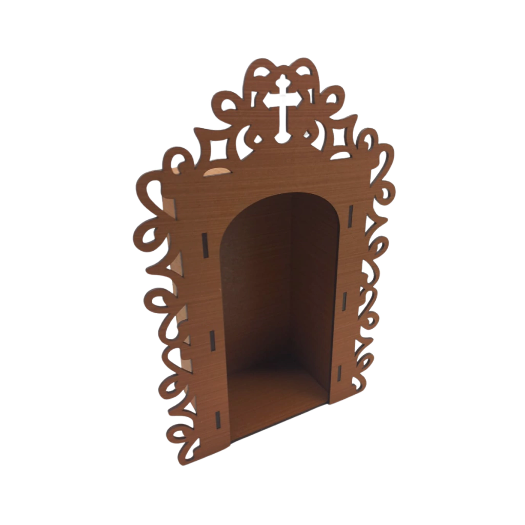 O Oratório Capela MDF Corte a Laser Tabaco é um item decorativo e religioso perfeito para quem deseja criar um espaço de oração aconchegante e sofisticado. Produzido em MDF de 2,5mm pintado na cor tabaco, seu acabamento elegante dispensa pintura adicional, tornando-se ideal para uso imediato ou para personalização com aplicações decorativas.