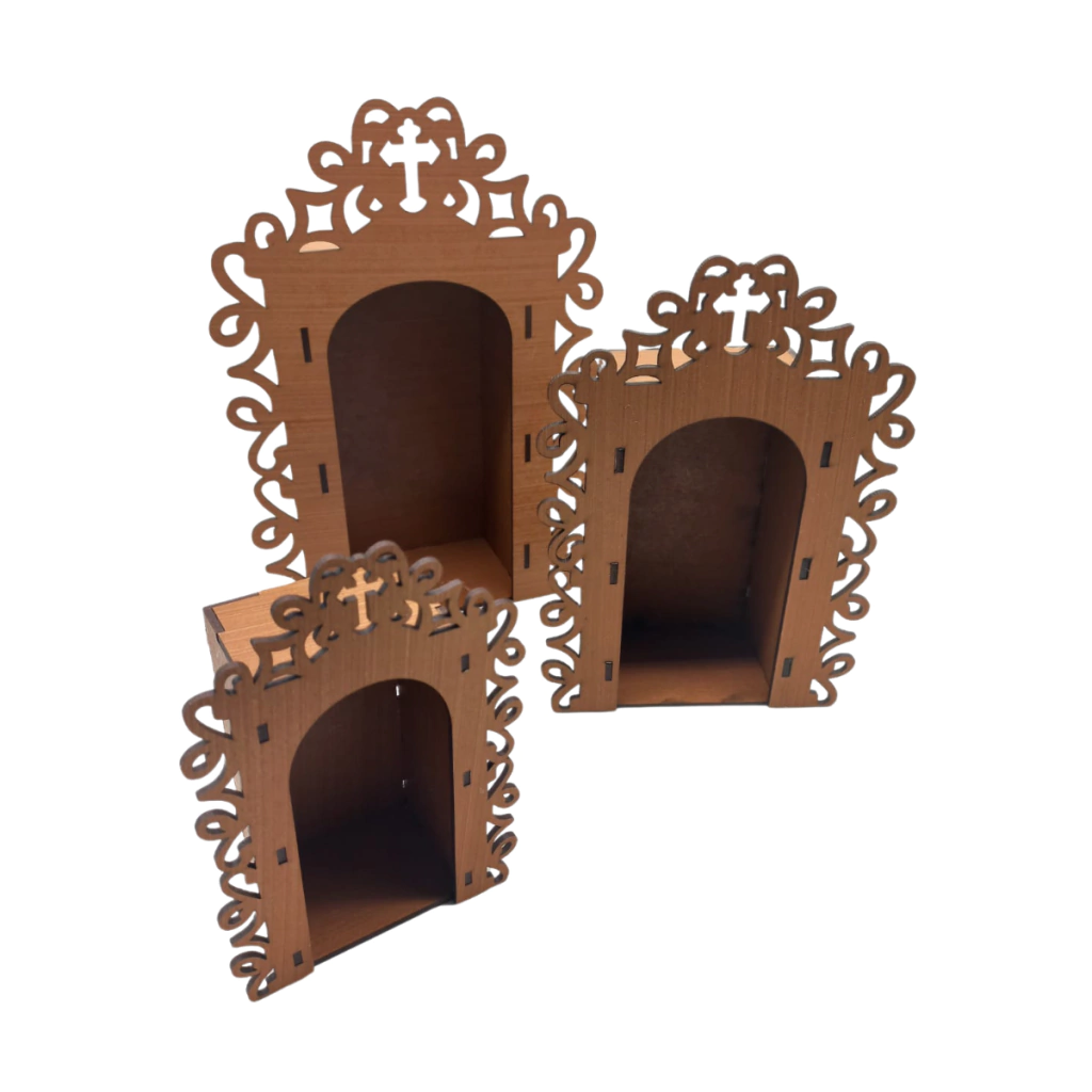 Disponível em três tamanhos (Pequeno: 15x10x5cm | Médio: 20x14,5x6,5cm | Grande: 25x17x7cm), este oratório oferece um espaço interno adequado para acomodar imagens de santos, acessórios religiosos e velas artificiais, sendo uma peça indispensável para altares, casas e ambientes espirituais.