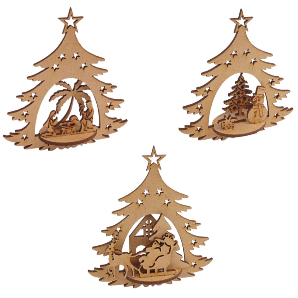 O Enfeite MDF Pendente Natalino 3D Vazado 10x9x3cm é uma peça encantadora que traz profundidade e sofisticação à decoração de Natal. Com formato de pinheiro, a peça é vazada com detalhes em estrelas recortadas e conta com uma estrutura interna montada em base, proporcionando um efeito tridimensional. No topo do pinheiro, há uma estrela vazada que reforça o tema natalino. Produzido em MDF cru de 2,5mm, o enfeite é leve, resistente e ideal para pendurar graças à argola superior. Disponível em três variações de tema interno — Boneco de Neve, Sagrada Família e Trenó —, cada uma traz um cenário diferente no interior da árvore, agregando ainda mais valor visual e simbólico à peça.