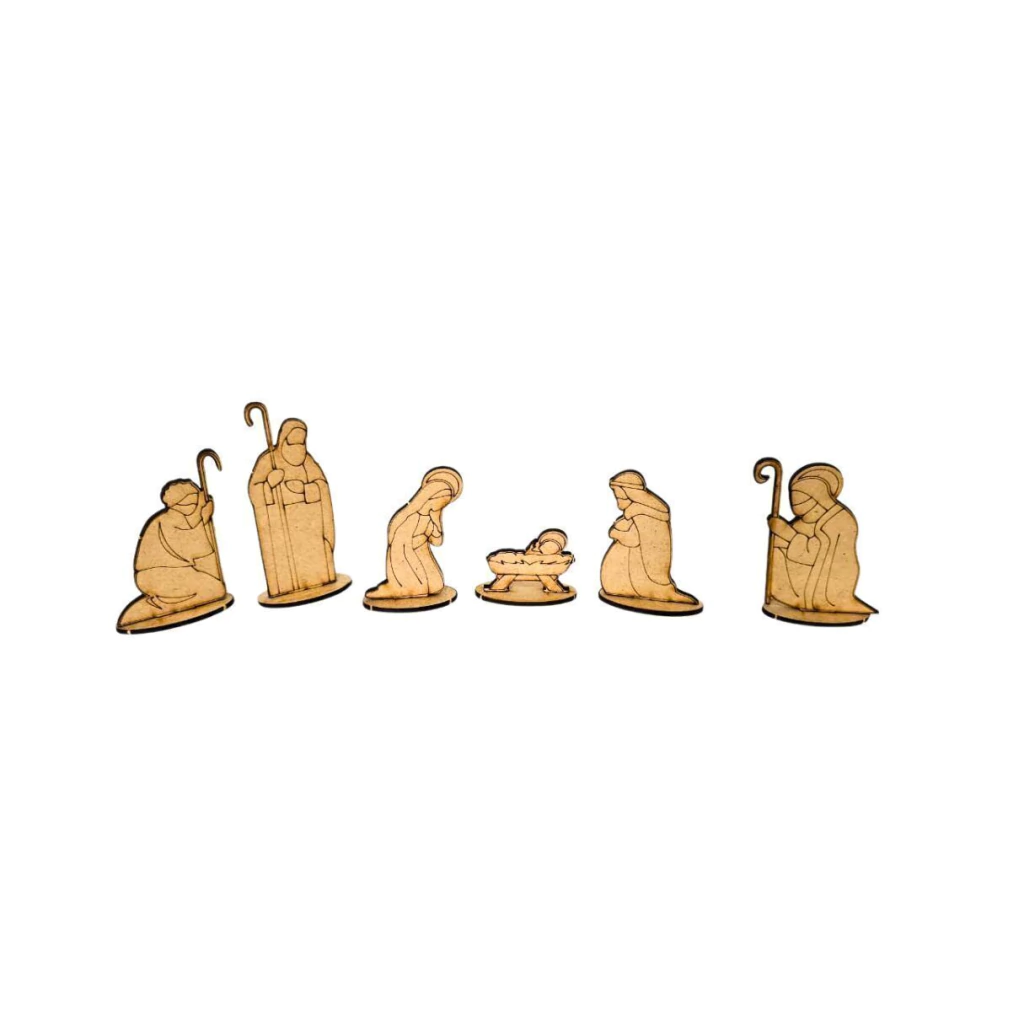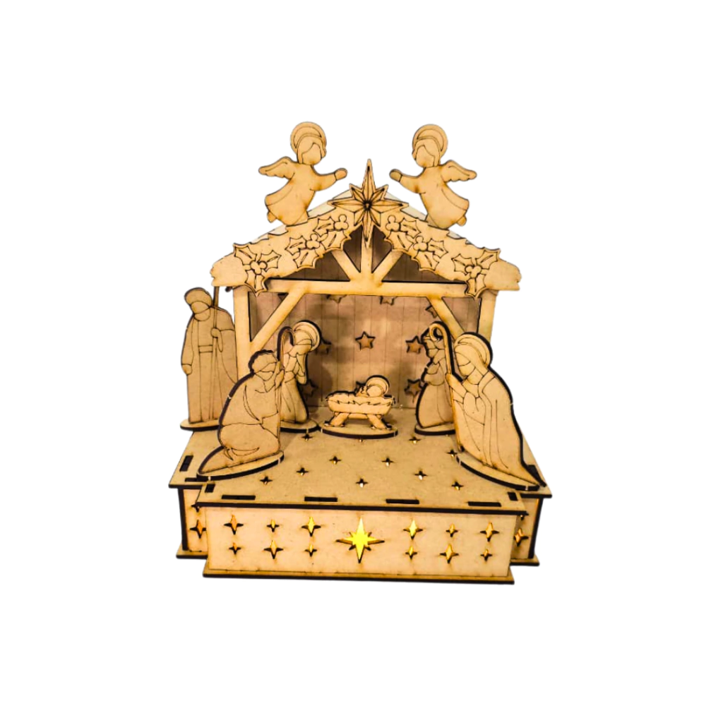 Produzido em MDF cru de 2,5mm e medindo 19x21x12cm, ele conta com as principais figuras do nascimento de Jesus: Maria, José, Menino Jesus e os Três Reis Magos, todas com acabamento em corte a laser de alta precisão.